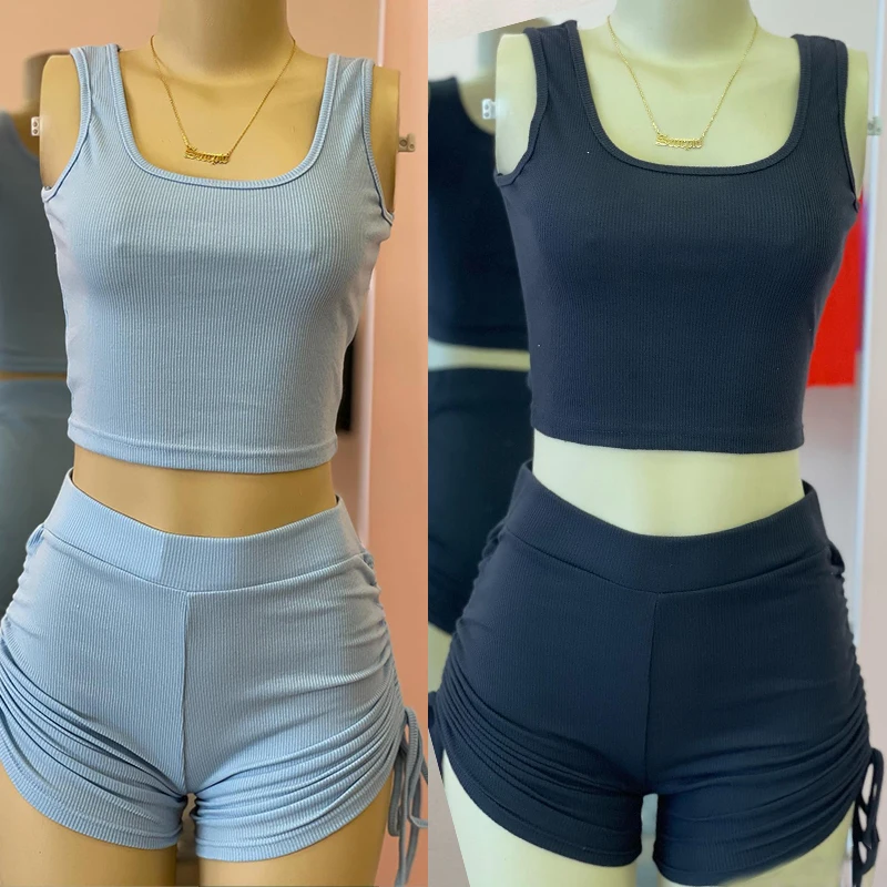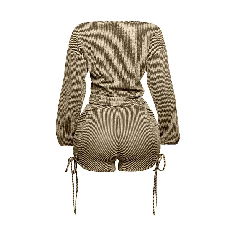 Huilin Manufacturer Oem Drawstring Long Sleeve v Neck Crop Top & Shorts Two Piece Clothing Summer Women Pajama Loungewear Set